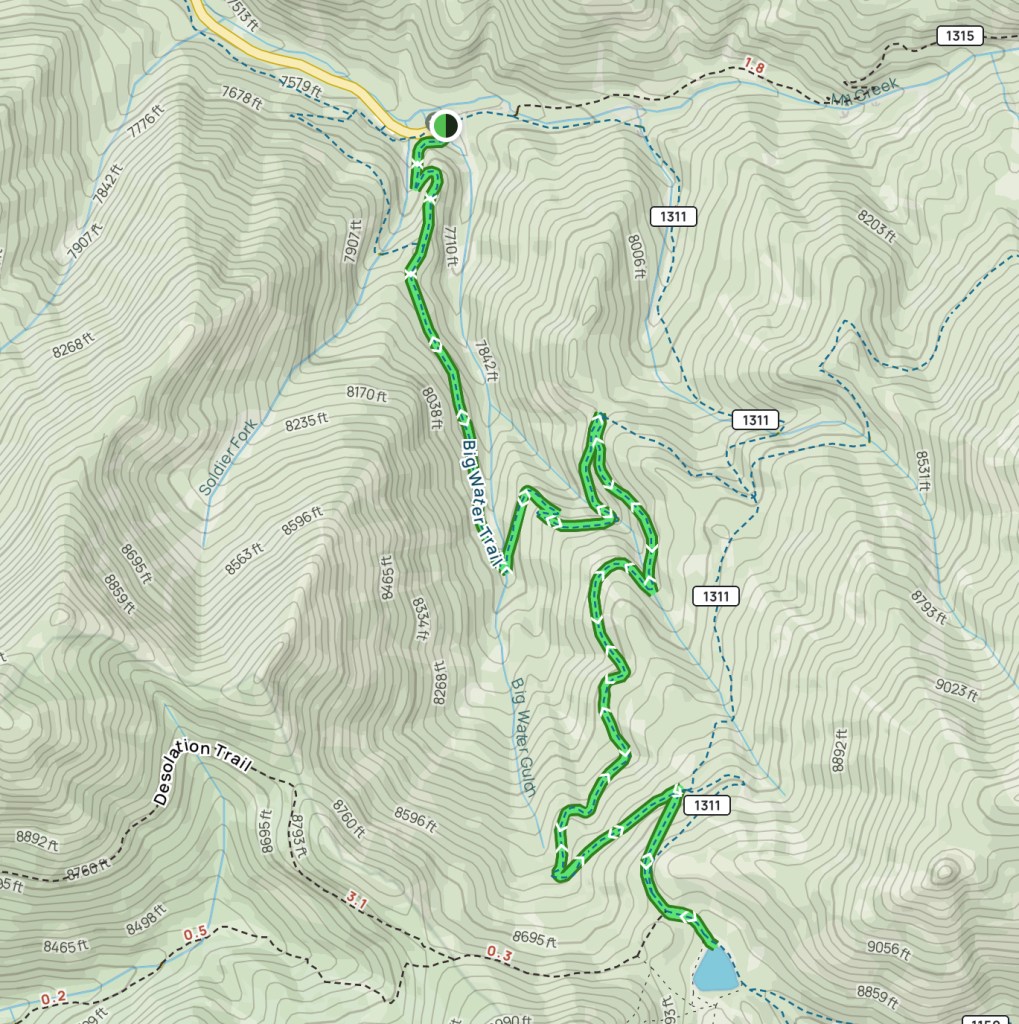 The next task was to find a place to camp for the night. We landed on Dog Lake, as we were told it would have plenty of flat area for a camp site. To get there we parked at the end of Mill Creek Canyon Road, and followed “Dog Lake via Big Water Trail” on Alltrails.